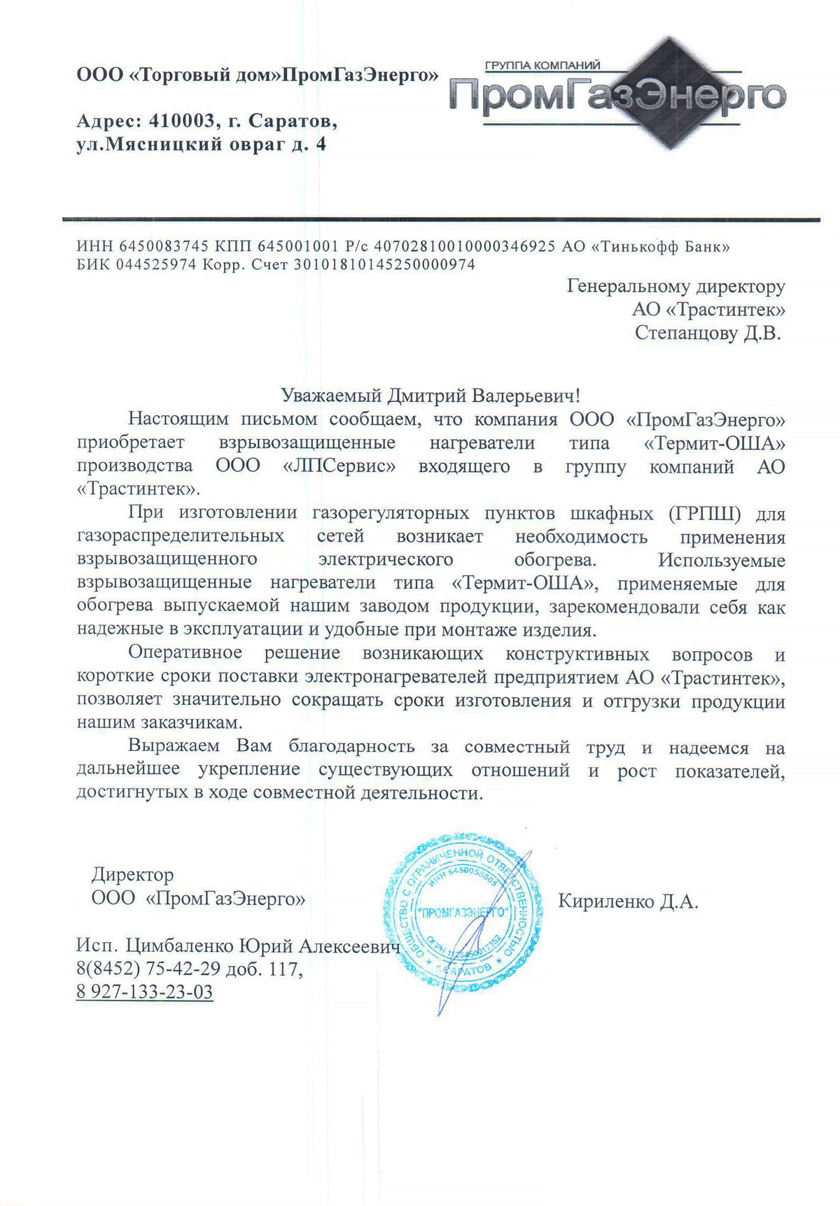 Благодарственное письмо от ООО «ТД «ПромГазЭнерго».