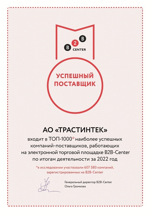 Компания «Трастинтек» вошла в список ТОП-1000 успешных поставщиков по итогам работы за 2022 год на электронной торговой площадке B2B-Center. Участников списка выбрал специальный алгоритм, который автоматически оценил эффективность работы по определенным критериям. Высокий статус подтверждает вклад в развитие конкуренции на российском рынке, результативность участия в закупках и доверие со стороны заказчиков.Другие новости